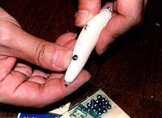 穴が開いたら、実際に取付けたい大きさのフックを付け、ウエイトとペンチを持ってルアーがアクションできる環境の場所にでかけます。 この複数の穴にウエイトを入れ固定することで実際にウエイトを埋めこんだルアーを再現します。 ルアーは、位置と、重さでアクションや飛び方が変化しますから、複数の穴に色々な重さのウエイトをセットして納得がいくまでベストバランスを見つけ出しすことが大切です。 |