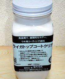 新型ルアーキャストの性能を是非体感ください。 ※使用方法や使い心地等は、従来のルアーキャストと同じです。 今回の同じ感覚でより使いやすくなった…と理解ください。 尚、今回の改良に伴っての価格変更等はございません。 コーティング材防水、水性ウレタン上塗り専用塗料 ライガートップコート・クリアー 新発売!! ルアー製作において塗装後のトップコートによる色流れや、にじみといった失敗を誰もが経験した事があると思います。 従来、この色流れを防ぐ為に、エアブラシでコーテイング材を数回吹いては乾かす工程を数回繰り返すいわゆる「色止め」が必要でした。 又、塗装に使う塗料は、アクリル薄め液を一度飛ばし、再度ラッカーシンナーで薄めなければならないなど、塗装の色流れを防ぐ為に踏まなければならない準備工程が、以外にも多くあるのも事実です。 来画では、この色止め及び、塗料の下処理をしなくても、塗装後のコーテイングによる色流れや、にじみを完全に防げるウレタンシリコン系の新型トップコートを開発しました。