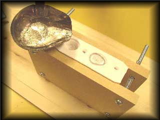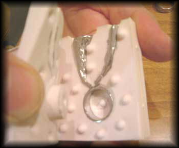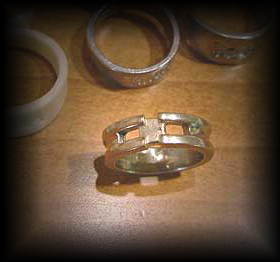 STEP4型から取り外す 鋳造が完了し、十分冷却したら、締金具がらシリコ−ン型を取り出し、2面型を分離して中から鋳造された指輪を取り出します。 注意:一度溶解した金属は、十分冷却時間を置かないと、火傷の危険性があり危険です。取り出すときは、必ず皮手袋等の防具を付けて行なってください。 |