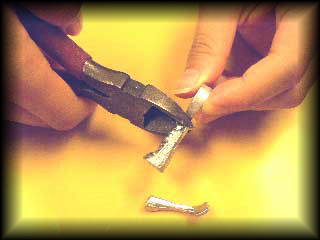 STEP5バリ取り 鋳造した指輪を取り出したら、十分冷えている事を確認して、バリ取り作業に移ります。注入口、エアー抜き穴の部分に余分なバリが出ますから、この部分をニッパー等でカットして、指輪部分だけにします。 |